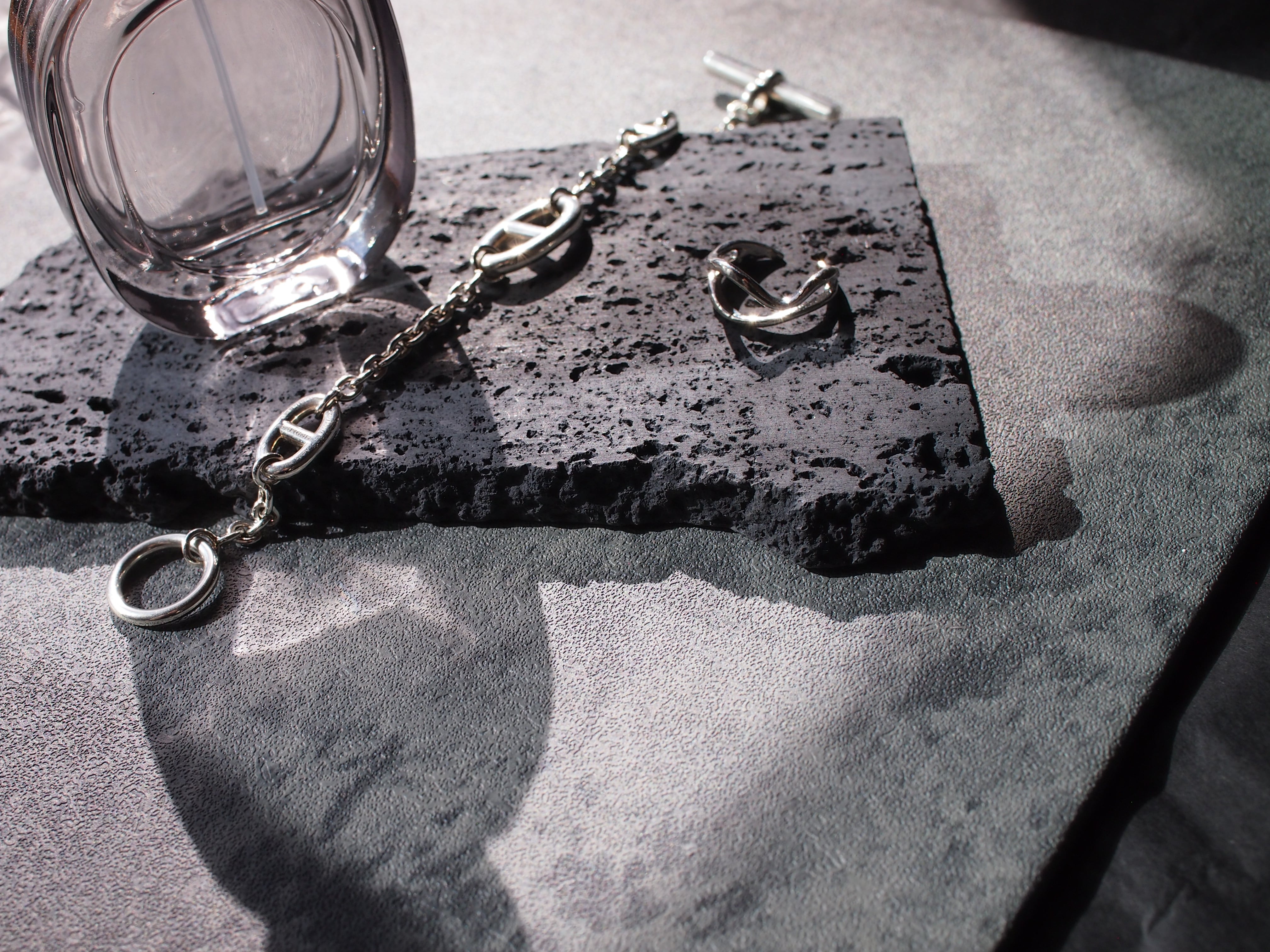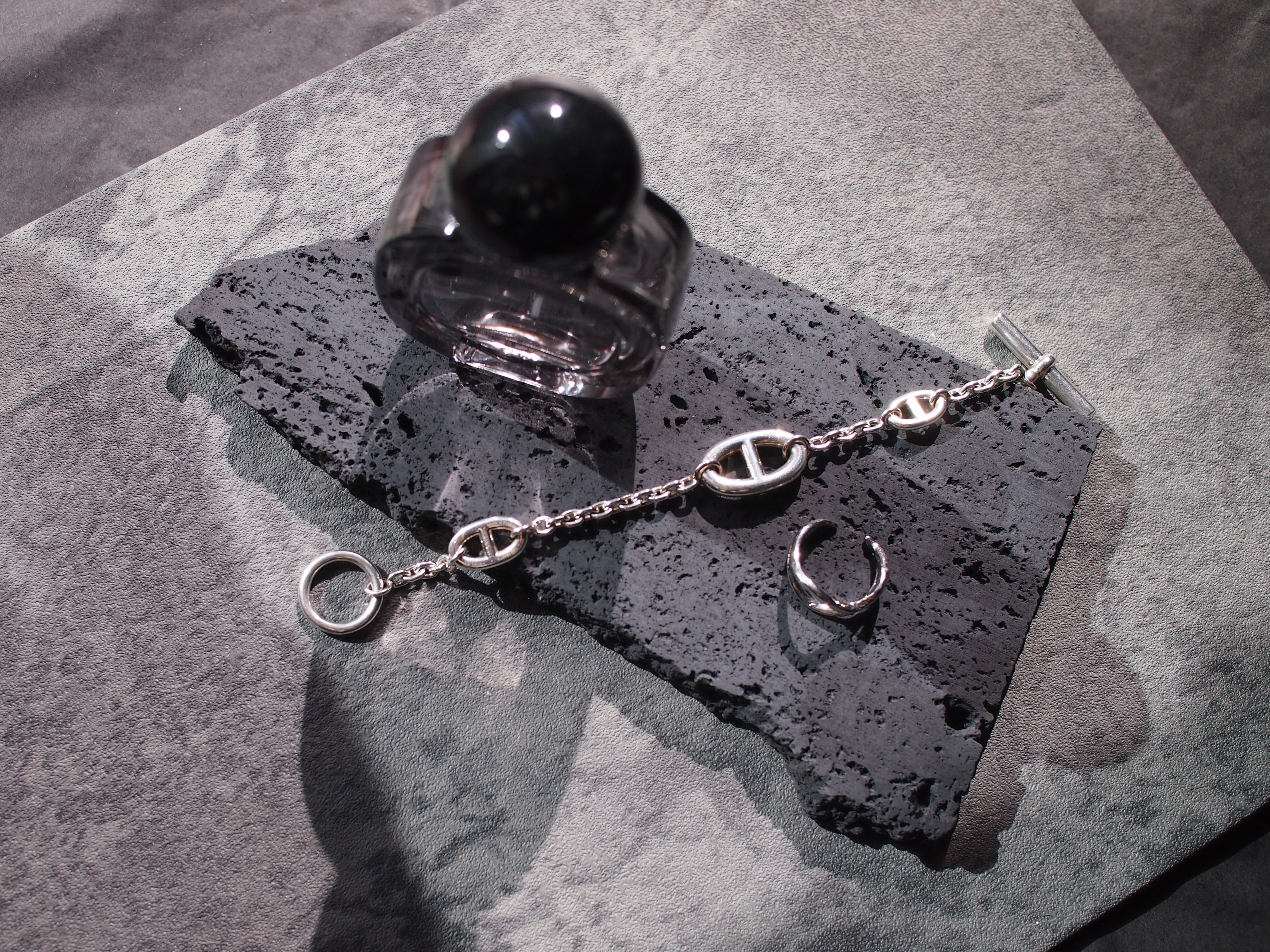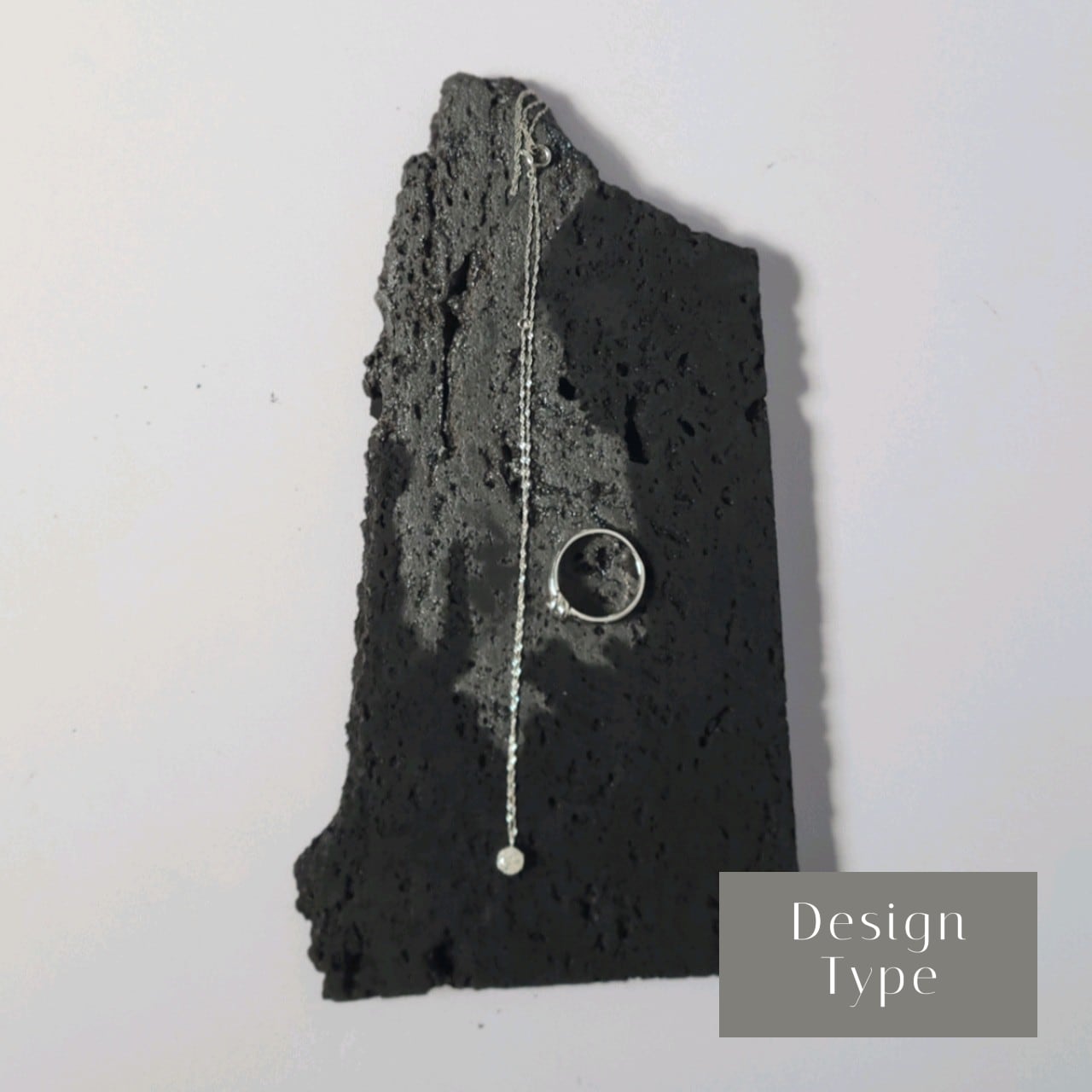 セメント片のような質感と、ジェスモナイトならではのマットな表情、そして手仕事による個体差が、このトレイの魅力です。横置きでアクセサリートレイとして使うのはもちろん、縦置きにしてブレスレットやネックレスを掛けるなど、ディスプレイ次第でさまざまな楽しみ方ができます。
