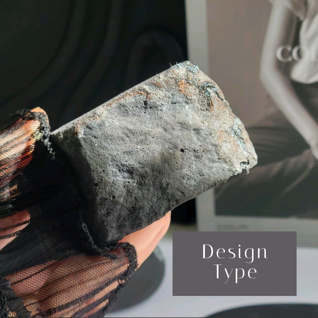 ◇デザイン入りは、ひび割れやにじみ、光の角度で変化する表情を楽しめる一点物仕様。大理石やテラゾを思わせる奥行きがあり、アートピースのような存在感があります。